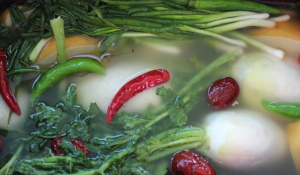 4. 2일이 지나면 무에서 물이 제법 많이 나오는데 이 물로 풀죽을 쑤어 쪽파 1줌, 배 1개, 마늘 10톨, 생강 1톨, 소금에 삭힌 고추 30개와 고루 섞은 다음 생수 4리터를 부어 준다.