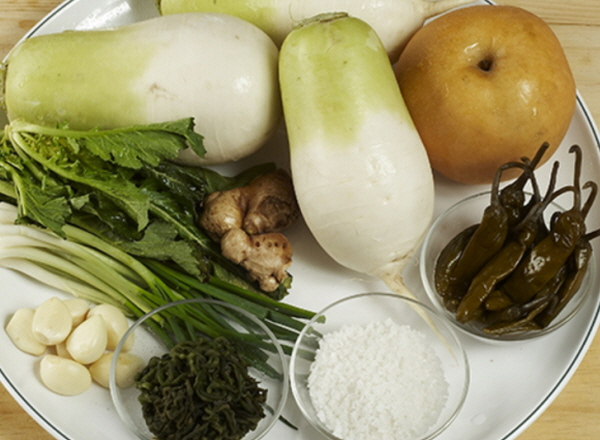작은 무 7~8개, 쪽파 1단, 마늘 8~10개, 고추 30개, 배 1개, 생강 1개, 소금 1/4컵, 물(생수) 4리터