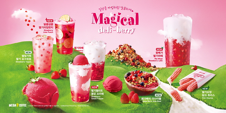 이번 딸기 시즌은 'Magical deli-berry'를 모토로 △딸기라떼 △왕메가 딸기라떼 △딸기젤라또 퐁당 프라페 △별빛가득 딸기 요구르트 △달콤상큼 딸기라임펀치 등 딸기 음료 5종과 △딸기요정 핑크츄러스 △메가베리 아사이볼 등 딸기 디저트 2종으로 구성했다.