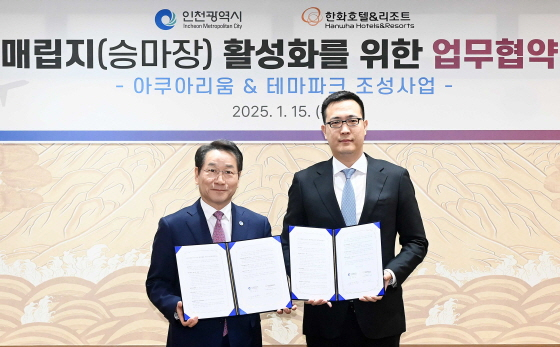 한화호텔앤드리조트와 인천시는 15일 '수도권매립지(승마장 부지) 활성화를 위한 업무협약(MOU)'을 체결했다. 협약식에는 김동선 한화호텔앤드리조트 미래비전총괄 부사장, 유정복 인천시장 등 주요 관계자들이 참석했다.