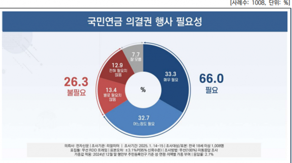여론조사기관인 리얼미터가 지난 14~15일 전국 만 18세 이상 남녀 1008명을 대상으로 실시한 설문조사(표본오차 95% 신뢰수준에서 ±3.1%포인트) 결과에 따르면, "고려아연 주주총회에서 국민연금이 환경·사회·지배구조(ESG)에 입각해 적극적으로 의결권을 행사할 필요가 있다고 생각하십니까?"라는 질문에 '그렇다'고 답한 비율이 66.0%로 나타났다. '불필요하다'고 답한 비율은 26.3%, '잘 모른다'고 답한 비율은 7.7%였다.
