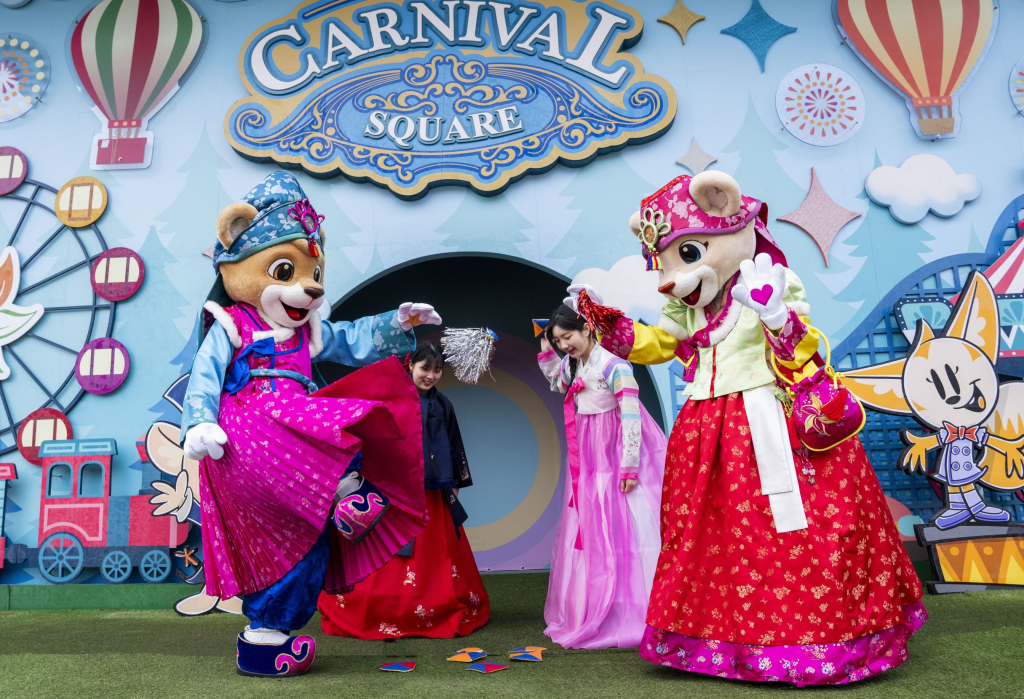 카니발 광장 옆 매직타임 레스토랑에서는 떡만두국과 전통 간식 등 설날 특선 메뉴를 맛볼 수 있고, 상품점에서는 한복 인형옷, 복조리 인형 등 설날 테마의 신규 굿즈 28종도 새롭게 선보여 명절 분위기를 제대로 느낄 수 있다.