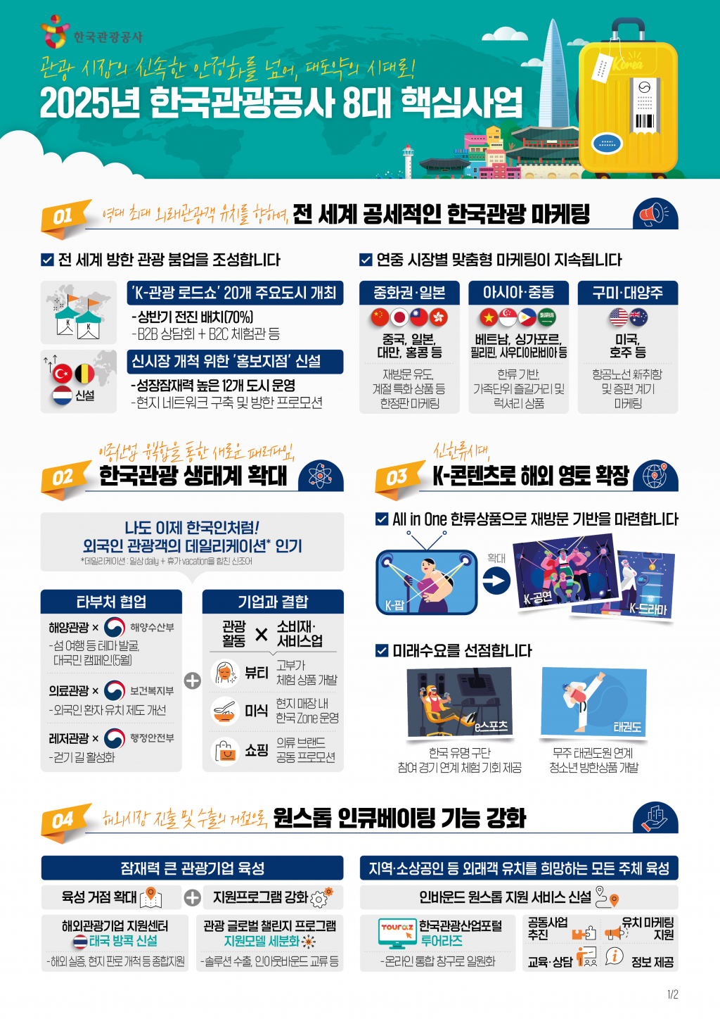 한국관광공사(사장직무대행 서영충, 이하 공사)는 '방한관광의 신속한 안정화를 넘어 외래관광객 역대 최대 성과를 달성하는 대도약'이라는 비전 아래 2025년 공사 8대 핵심사업을 발표했다.