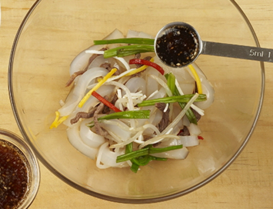 5. 도토리묵(또는 청포묵)을 채 썰어 뜨거운 물에 데친 후 찬물에 헹군다.