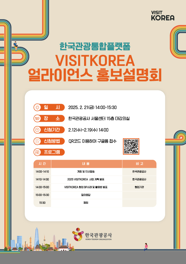 한국관광공사(사장직무대행 서영충, 이하 공사)는 오는 3월 4일까지 한국관광통합플랫폼 'VISITKOREA(visitkorea.or.kr, 이하 VK)'와 협업할 'VK 얼라이언스' 회원사를 모집한다.