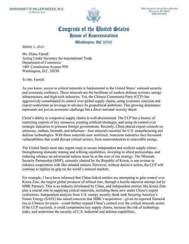 마리아네트 밀러-믹스(Marianette Miller-Meeks) 미국 연방 하원의원이 미국 상무부에 서한을 보내 MBK 파트너스의 고려아연 적대적 M&A 시도에 우려를 표했다. "중국 투자를 받은 MBK가 세계 최대 제련 기업인 고려아연을 인수하면 광물·자원 분야에서 중국의 통제력이 더 커질 수 있다며, 정부와 의회가 협력해 대응 방안을 모색해야 한다"고 피력했다.