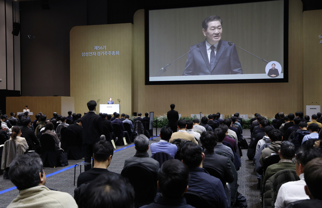삼성전자는 19일 경기도 수원시 수원컨벤션센터에서 열린 56기 정기 주주총회에서 한종희 DX부문장 부회장과 전영현 DS부문장 부회장은 각 사업부문별 경영전략을 주주에게 설명했다.