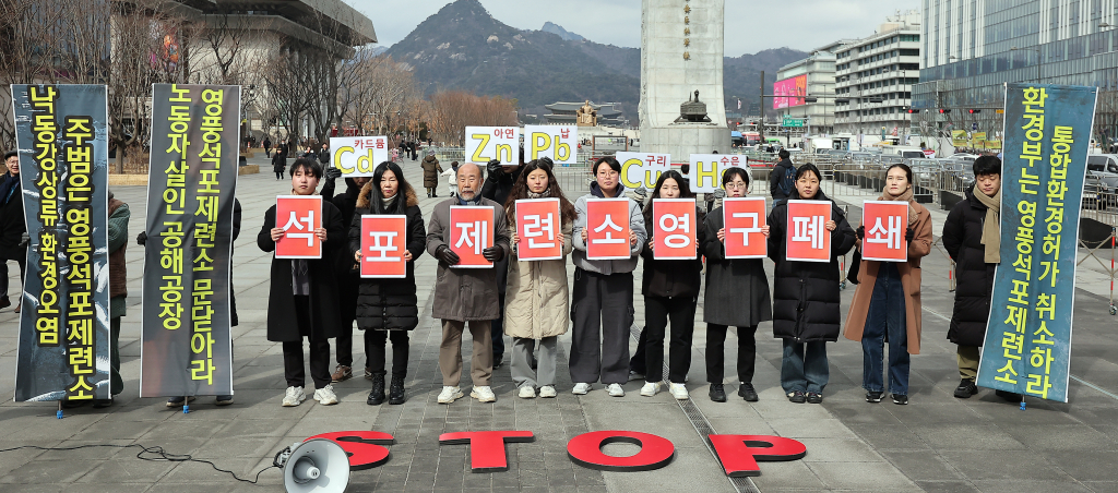 환경보건시민센터가 지난 2월 서울 종로구 광화문광장 이순신 장군 동상 앞에서 열린 영풍석포제련소 영구폐쇄를 촉구하는 기자회견에서 피켓 퍼포먼스를 하고 있다./사진=뉴스1