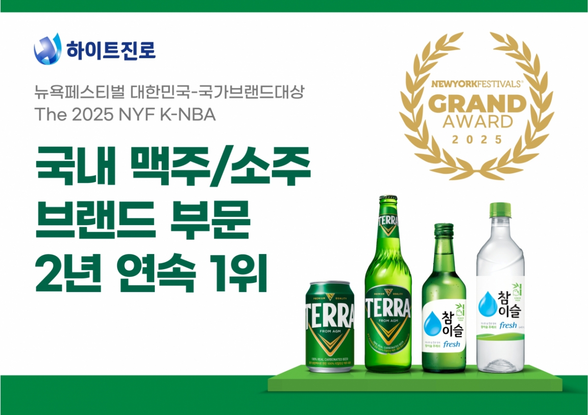 하이트진로는 '2025 뉴욕페스티벌 대한민국 국가브랜드 대상'에서 '테라'와 '참이슬'이 각각 맥주 부문과 소주 부문에서 2년 연속 대상을 수상했다고 8일 전했다.