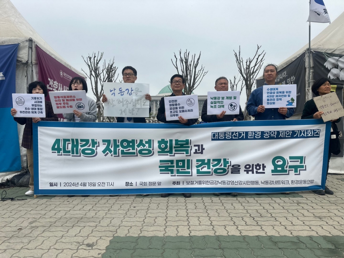환경운동연합과 낙동강네트워크, 보 철거를 위한 금강·낙동강·영산강 시민행동 등 환경단체들은 지난 18일 서울 여의도 국회 앞에서 제21대 대통령 선거 환경공약 정책제안 기자회견을 열었다. 이들은 "우리는 4대강의 자연성 회복과 국민 건강을 지키는 정책을 후보자들이 공약으로 제시할 것으로 촉구한다"며 △세종보 재가동 중단 △낙동강 녹조 대책 마련 △하천의 자연성 회복 △4대강 보 처리 방안 추진 △하구둑 개방 △초고도 오폐수처리 의무화 등의 정책을 제안했다.