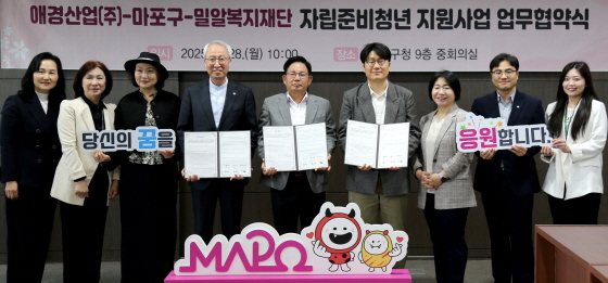 애경산업이 마포구·밀알복지재단과 함께 지난 28일 마포구청에서 자립준비청년 및 취약계층 지원을 위한 3자 업무협약을 체결했다.