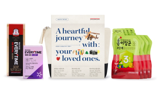 '정관장 헬시트립세트'는 여행지에서 간편하게 면역력과 피로를 관리할 수 있도록 '에브리타임로얄(10포)', '홍이장군3단계로얄(4포)', '에브리타임필름 컴피(20포)'으로 구성된 온 가족 건강 파우치다. '헬시트립세트골드'는 부모님 동반 여행 시 기력회복을 도울 수 있도록 '황진단(2환)'이 추가되었다.