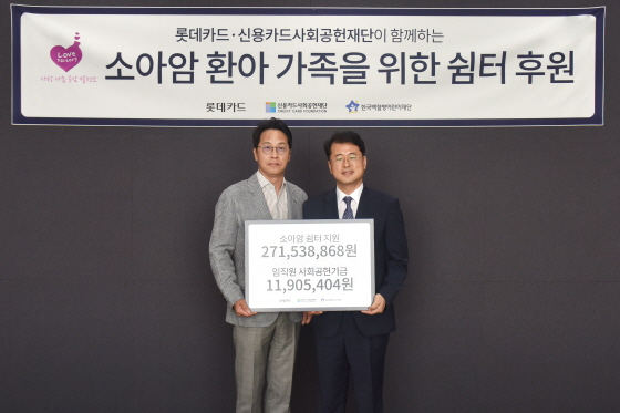 롯데카드가 10일 서울 종로구 롯데카드 본사에서 한국백혈병어린이재단과 소아암 환아와 가족을 위한 쉼터 후원금과 임직원 사회공헌기금 전달식을 진행했다.