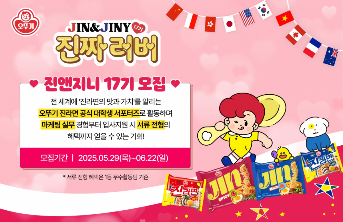 오뚜기가 차세대 글로벌 마케터를 꿈꾸는 대학생을 대상으로 진라면 공식 서포터즈 '진앤지니(Jin&JINY)' 17기를 모집한다고 13일 밝혔다.