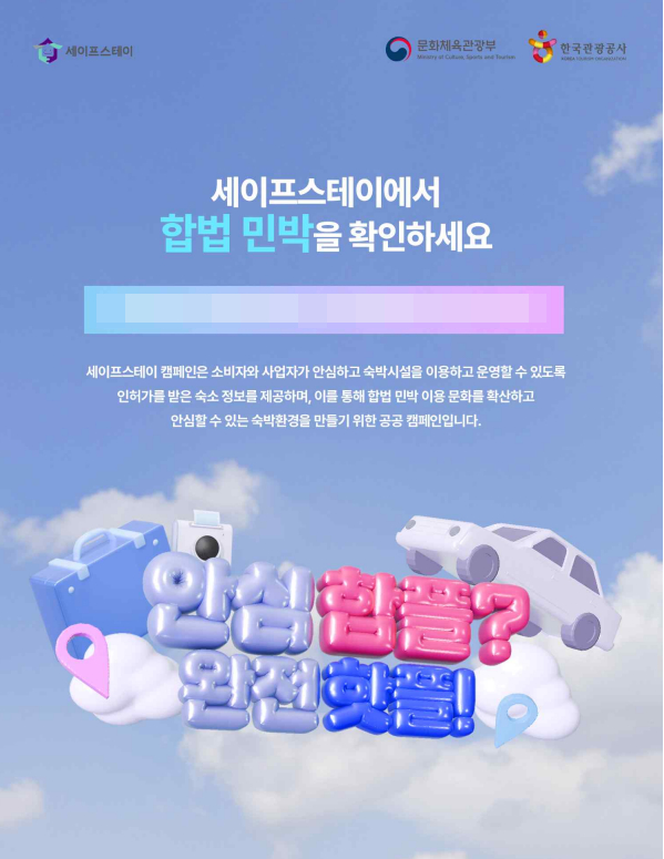 문체부는 "소비자가 안심하고 민박시설을 이용할 수 있도록 인허가된 합법 민박업소의 정보를 제공하는 '세이프스테이' 누리집 이용을 장려하고, 이를 통해 합법 숙소 이용 문화를 확산하는 캠페인"이라고 설명했다. 누리집에서는 숙소명이나 지역 검색을 통해 외국인관광 도시민박업, 한옥체험업, 관광펜션업, 호스텔업 등 등록 민박업소 정보와 조식 제공 여부, 주차 가능 여부 등 세부 정보가 제공된다.