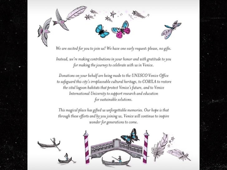 이런 가운데 ABC가 입수한 결혼식 초대장도 화제가 됐다. 200명의 하객에게 발송된 초대장에서 커플은 "부디 선물은 사양합니다"라며 대신 베니스의 3개 자선단체에 기부할 것을 요청했다. "이 마법같은 장소가 우리에게 잊을 수 없는 추억을 선사했습니다. 여러분이 함께해 주심으로써 베니스가 다음 세대에도 계속 경이로움을 전할 수 있기를 바랍니다"라는 메시지도 담겼다.