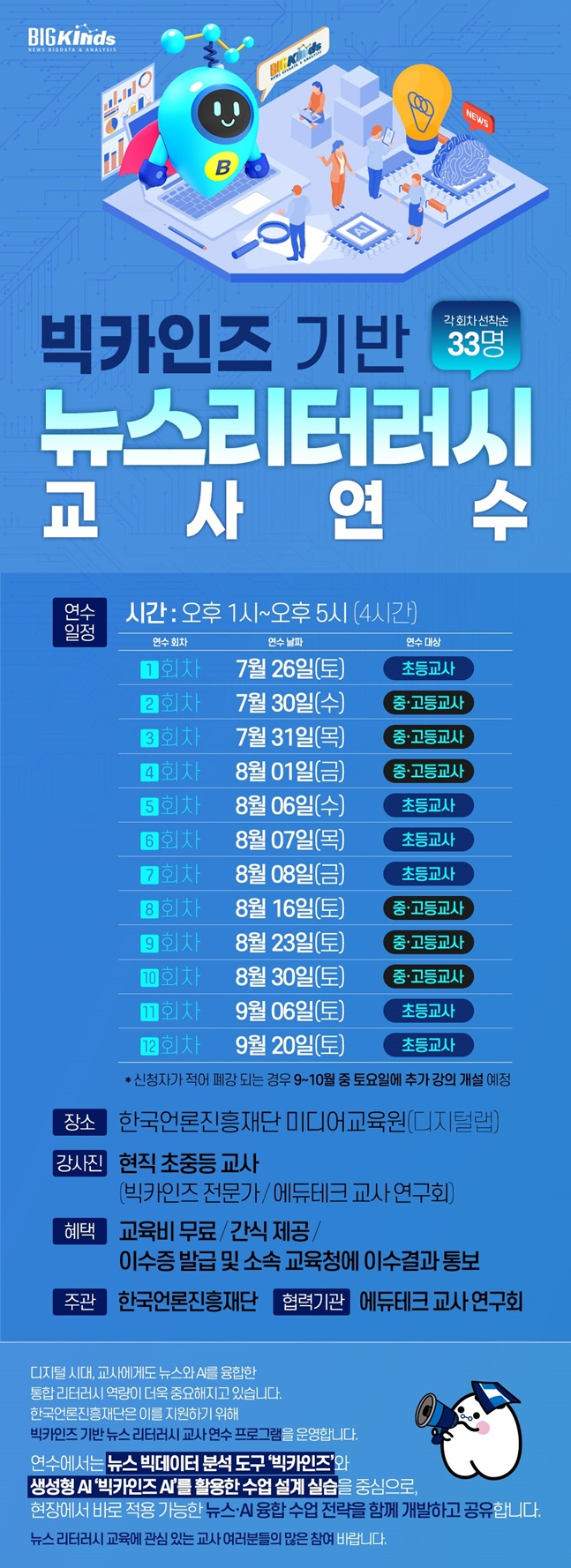 아울러 7월부터 9월까지 언론재단 미디어연구원에서는 '빅카인즈 기반 뉴스 리터러시 교사 연수'를 총 12회 진행한다. 회차당 교사 30여 명을 대상으로 4시간 동안 뉴스 빅데이터와 생성형 인공지능(AI) 이론 강의와 실습으로 뉴스·인공지능 이해력(리터러시)을 높일 예정이다.