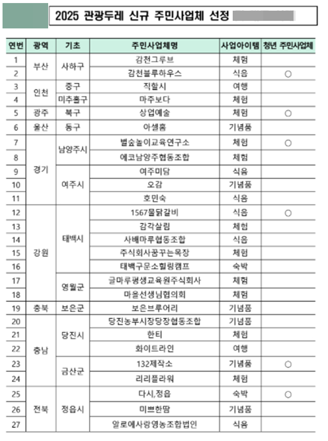 문화체육관광부는 한국관광공사(사장 직무대행 서영충)와 함께 2025년 관광두레 사업 지원 대상을 공모해 21개 지역의 주민사업체 45개소를 선정했다고 밝혔다.