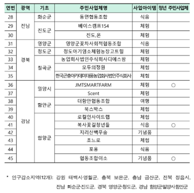 또한 청년두레(구성원 ⅔ 이상이 만 39세 이하)는 9개소가 포함됐으며, 태백시·정읍시·함양군 등 12개 인구감소지역에서는 주민사업체 28개소가 선정돼 전체의 62%를 차지했다.
