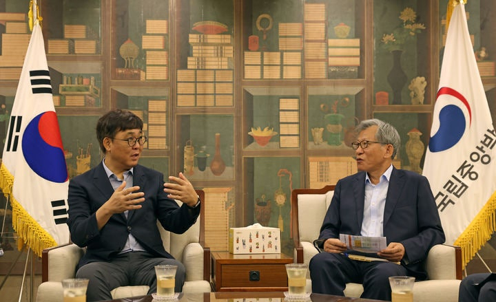 최휘영(왼쪽) 문화체육관광부 장관이 3일 서울 용산구 국립중앙박물관을 방문해 유홍준 국립중앙박물관장과 주요 현안에 대해 의견을 나누고 있다. /사진=문화체육관광부 제공