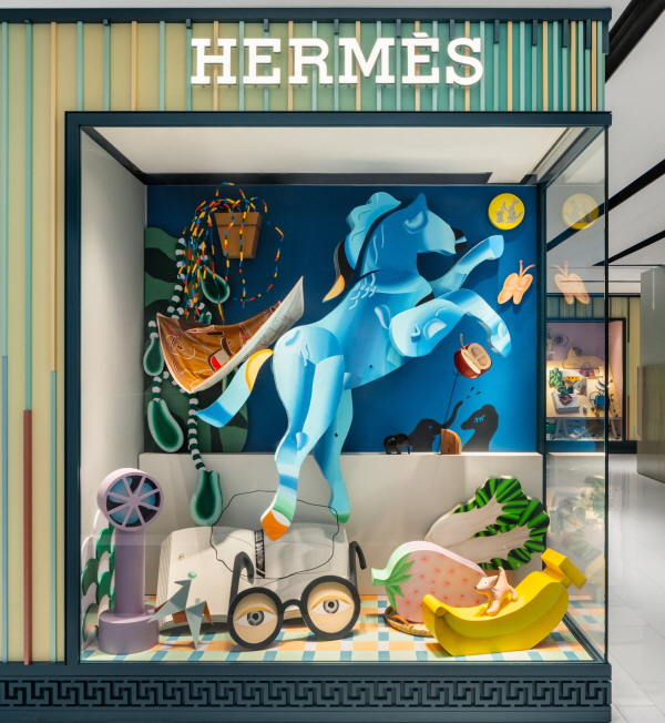 새 매장에는 한국 전통 예술과 K팝의 역동성을 반영한 디자인을 적용했다. 외관은 단청 문양에서 영감을 받아 현대적으로 재해석했고, 내부는 K팝 문화에서 착안한 파스텔과 네온 색상의 대비를 통해 활기를 강조했다. 윈도 디스플레이는 현대미술작가인 이미주와 협업해 올해의 에르메스 테마 '드로잉, 창작의 시작(Drawn to craft)'을 바탕으로 제작했다.