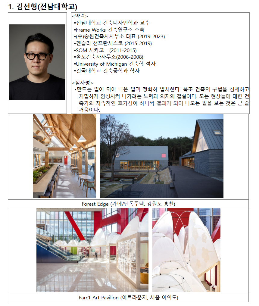 문화체육관광부(장관 최휘영)는 (사)새건축사협의회, (사)한국건축가협회, (사)한국여성건축가협회와 함께 '2025년 젊은 건축가상'의 수상자로 ▶전남대학교 김선형 ▶에이루트건축사사무소 이창규·강정윤 ▶에이코랩건축사사무소 홍진표·정이삭 씨 등 3개 팀을 선정했다고 3일 밝혔다.