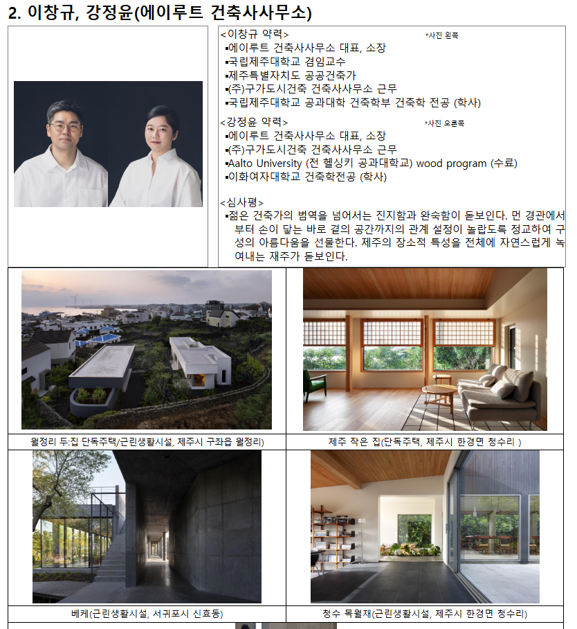 총 50개 팀이 지원한 이번 공모에서는 1차 서류심사와 2차 공개 시청각발표(프레젠테이션)를 거쳐 수상자를 결정했다. 심사위원회(위원장 손진)는 건축가의 건축에 대한 기본적 소양과 태도, 주변 맥락에 대한 진지한 탐구, 사회공동체의 미래에 대한 비전과 확장성을 종합적으로 평가했다.