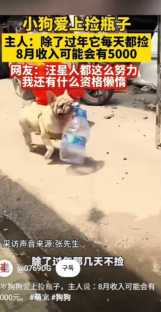 중국 광동성 광저우에서 페트병을 수집해 돈을 버는 프렌치 불독이 인터넷 스타가 되며 화제를 모으고 있다.