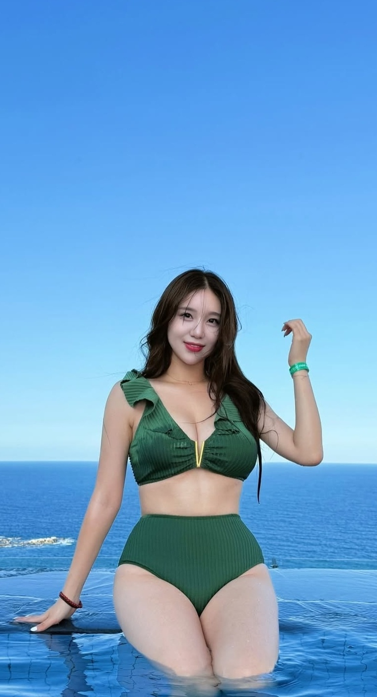 사진 속 김현영 치어리더는 초록색 비키니를 입고 수영장에서 포즈를 취하고 있다.