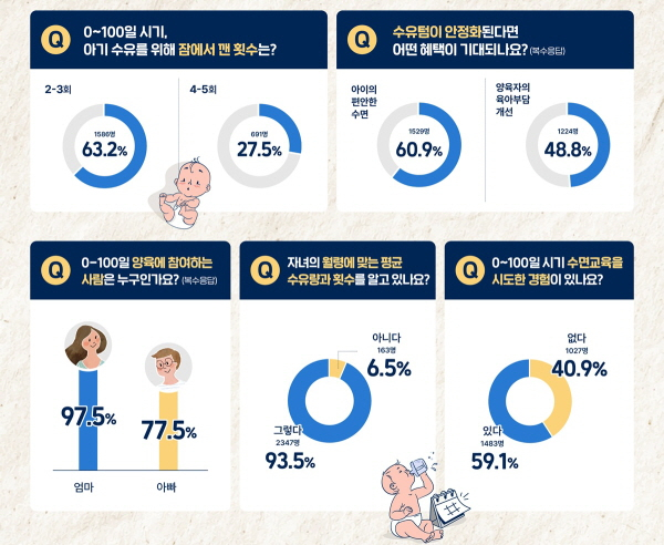 특히 수유로 인해 잠을 깬 회수를 묻는 질문에 63.2%가 2~3회 이상 잠을 깬다고 답했으며, 4~5회 잠을 깬다는 답도 27.5%에 달해 불규칙한 수유텀(수유 간격)으로 인한 야간 수유가 육아에 가장 큰 어려움인 것으로 나타났다. 뒤를 이어 소화 문제(49.2%), 피부 문제(29.8%), 배변 문제(29.5%) 등이 꼽혔다.