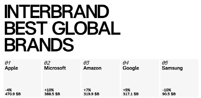 인터브랜드는 ▲기업의 재무 성과와 전망 ▲제품 구매 시 브랜드가 미치는 영향 ▲브랜드 경쟁력(소비자 공감 및 참여, 브랜드 전략, 차별성, 일관성, 신뢰성 등) 등을 종합 분석해 매년 브랜드가치를 평가한다. 전 세계 브랜드가치 평가 중 가장 역사가 길며 공신력을 인정받고 있다.
