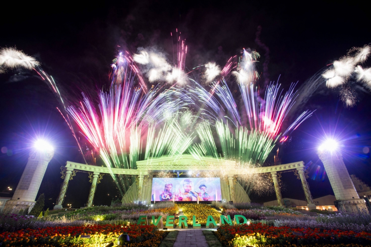 먼저 지난 12일부터 에버랜드는 '골든(Golden)', '하우 잇츠 던(How It's Done)', '소다 팝(Soda Pop)', '유어 아이돌(Your Idol)' 등 영화 속 히트곡들과 수천 발의 불꽃, 영상, 특수효과 등이 어우러진 신규 야간 공연 '케이팝 데몬 헌터스 싱어롱 불꽃쇼'를 새롭게 론칭했다.