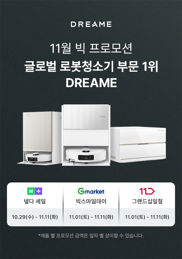 스마트 홈 브랜드 드리미 테크놀로지(Dreame Technology)가 네이버·G마켓·11번가 등 3대 메인 온라인 채널에서 'BIG 프로모션'을 진행한다고 3일 밝혔다.