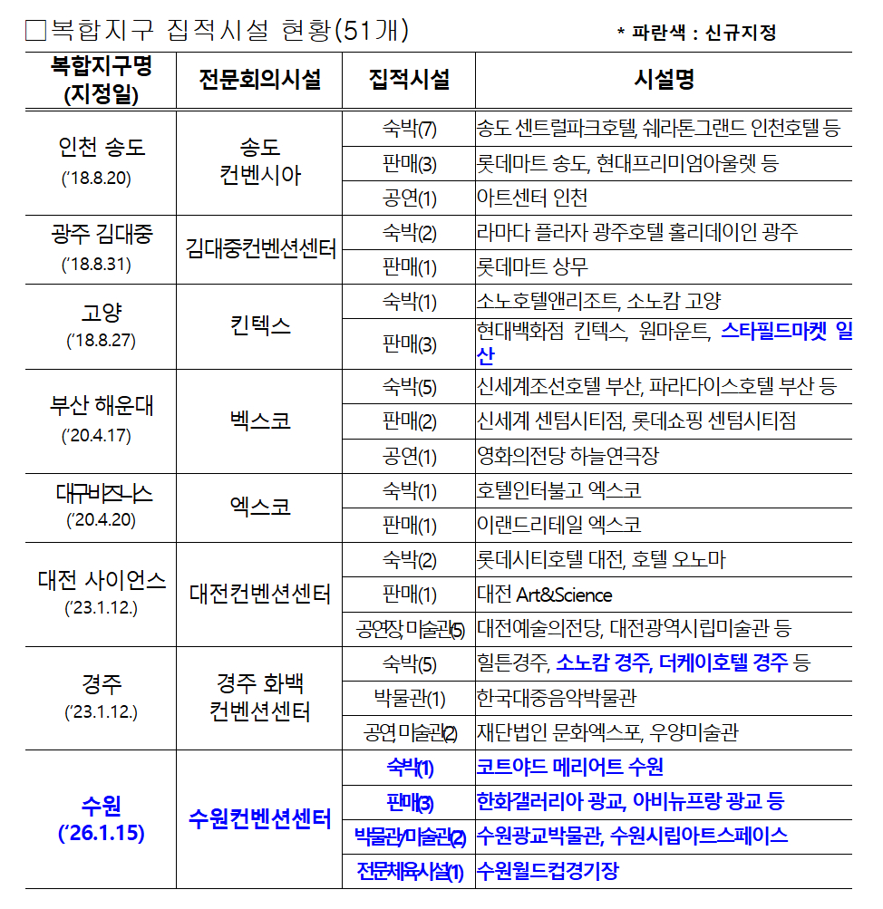 아울러 문체부는 복합지구 운영을 활성화하기 위해 국제회의집적시설 총 10개소를 추가로 지정했다. 수원 복합지구에는 ▶코트야드 메리어트 수원(숙박시설) ▶수원광교박물관(박물관) ▶수원월드컵경기장(체육시설) 등 총 7개소를, 고양 복합지구에는 ▶스타필드마켓 일산점(판매시설) 1개소, 경주 복합지구에는 ▶소노캄 경주(숙박시설) ▶더케이호텔 경주(숙박시설) 등 총 2개소를 추가 지정해 향후 지역의 마이스 기반 시설이 한층 강화될 전망이다.