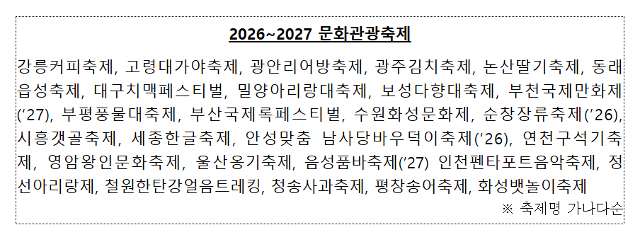 문체부와 한국관광공사는 문화관광축제의 경쟁력을 강화하고 그 인지도를 높이기 위해 2026년부터 2027년까지 2년간 국비(지원 축제별 4000만 원)와 함께 국제 홍보, 관광상품개발, 콘텐츠 경쟁력 강화, 인공지능(AI) 활용 수용 태세 개선 등을 종합 지원한다.