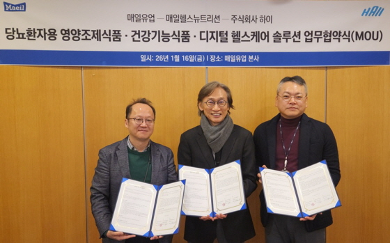 매일유업과 자회사 매일헬스뉴트리션, 그리고 디지털 헬스케어 기업 하이가 영양 솔루션과 디지털 헬스케어 기술을 결합한 미래형 건강관리 모델 구축을 위한 3자 업무협약(MOU)을 체결했다.