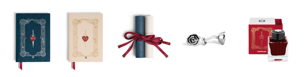 마이스터스튁 로미오 & 줄리엣 컬렉션은 파인 스테이셔너리와 액세서리로 확장된다. 크림 및 틸 컬러 레더 노트에는 하트와 단검 모티프가 장식되어 있으며, 동일한 컬러의 원통형 펜 파우치는 한 쌍으로 제공되어 동봉된 새틴 리본을 사용하여 하나로 묶을 수 있다. 여기에 장미 모양의 실버 커프링크스와 스페셜 에디션 베로나 레드 잉크가 컬렉션을 완성한다.