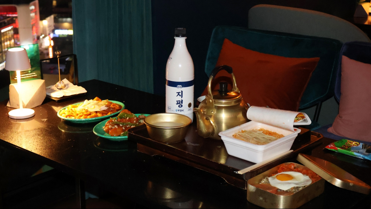 모던한 루프탑 바 분위기와 대비되는 양은 주전자에 담긴 '지평생막걸리', 그리고 지평소주를 활용한 '쏘맥(소주+맥주)'을 잔술 형태로 제공되며, 막걸리를 주전자에 담아 잔에 따라 마시는 방식은 외국인 관광객들에게 한국의 로컬 감성을 직관적으로 전달하며 색다른 즐거움을 선사하고 있다.