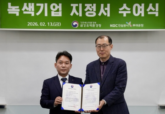 KGC인삼공사 부여공장이 지난 1월 30일 금강유역환경청으로부터 녹색기업으로 선정됐다. 2월 13일 오후 충남 부여군에 위치한 부여공장에서는 금강유역환경청과 함께 '신규 녹색기업 현판식'이 진행됐다.