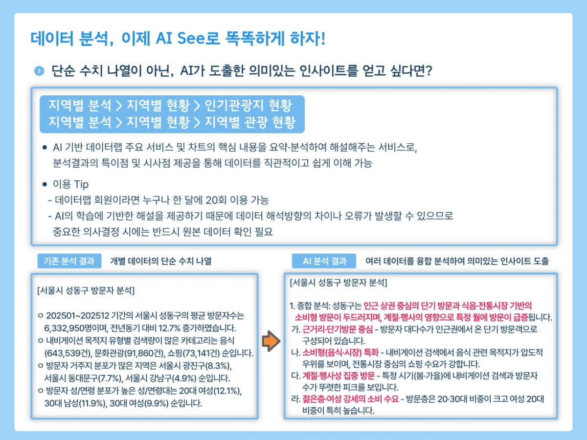 이번 개편은 인공지능(이하 'AI') 기술과 신규 데이터를 융합해 분석 범위를 확대하고, 지자체와 업계의 실무 활용도를 높이는 데 중점을 두었다. 특히, 새롭게 도입된 AI 해설사 'AI See'는 방대한 데이터를 자체적으로 분석하여 사용자가 즉각적으로 활용할 수 있는 '지식' 형태로 제공한다. 단순한 통계 수치 제공을 넘어 발생원인 추정 분석과 핵심 요약, 실전 전략 인사이트까지 통합적으로 설명한다. 공사는 시범 운영을 거쳐 사용자 피드백을 수렴한 후 적용 메뉴를 순차적으로 확대할 계획이다.