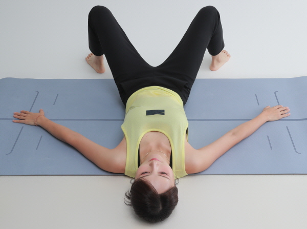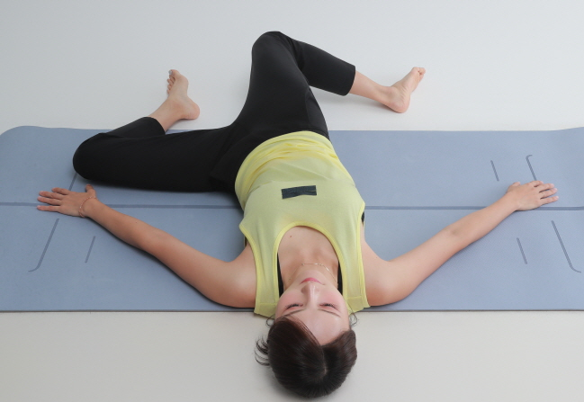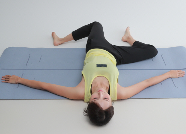 두 무릎을 한쪽으로 눕혀준다. 10초간 유지 후 다시 제자리로 돌아와 반대 방향으로 동일하게 반복한다. 이때 아래쪽 발로 위 무릎을 지긋이 눌러주면 더 늘어나는 느낌을 받을 수 있다. 좌우 번갈아5~7회 반복한다.