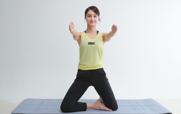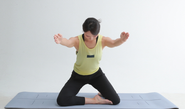 STEP2양손은 어깨 높이로 들어 올린다. 엉덩이 좌우가 바닥에 고르게 닿도록 좌골을 눌러준다. 허리는 중립으로 만들어유지해 준다.