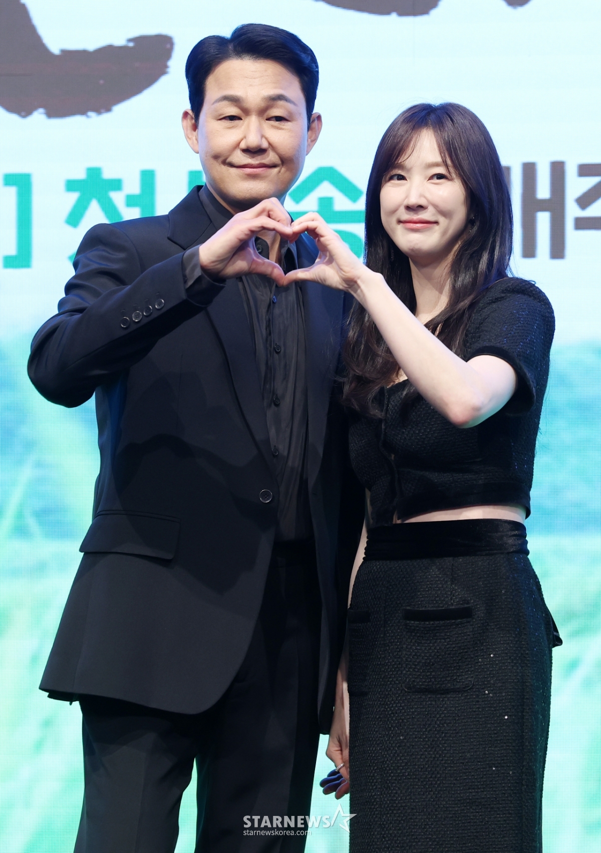 Actors Park Sung-woong and Lee Soo-kyung pose at the KBS 2TV drama "Shimwoo-myeon Yeonri-ri" production presentation held at The St. in D-Cube City, Guro-gu, Seoul on the 25th. /2026.03.25