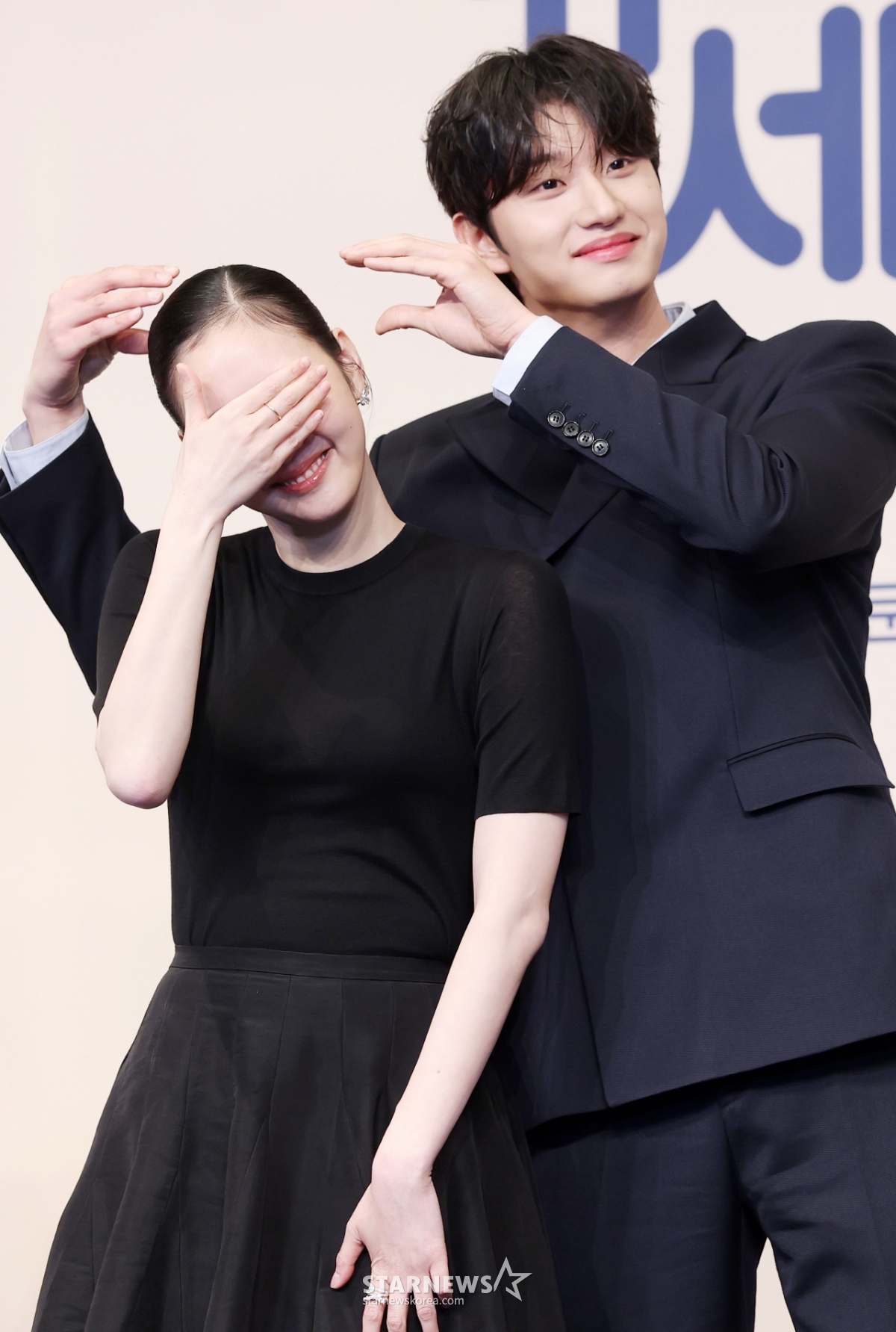 Actors Kim Go-eun and Kim Jae-won pose at the production presentation of the TVing drama "Yumi's Cells Season 3" held at The Link Hotel in Guro-gu, Seoul on the 7th. /2026.04.07