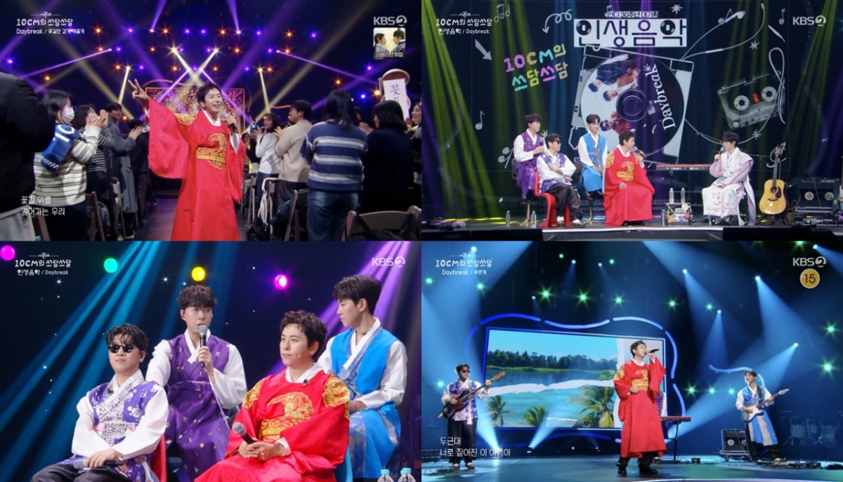 Daybreak (Lee Won-seok, Kim Sun-il, Kim Jang-won, and Jung Yoo-jong) appeared on KBS2's music talk show "The Seasons-10CM's Patdam's 30th Anniversary Plan-Life Music," which aired on the 2nd, and appeared in a royal robe. Vocalist Lee Won-seok tactfully shouted, "Will Jim be sitting while singing?" and raised the audience to raise the atmosphere of the scene at once.