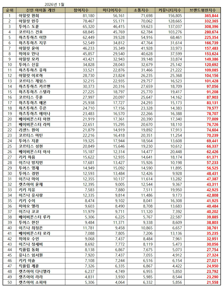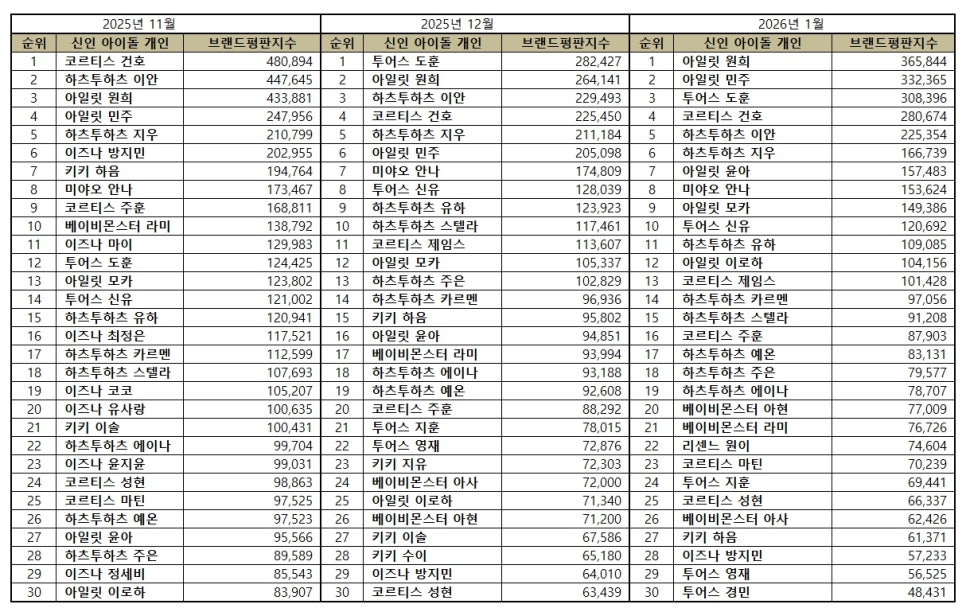 - January 2026, rookie idol's individual brand reputation