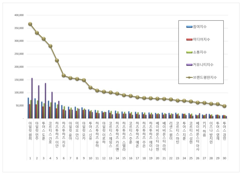 The No. 2 ILLIT Minju brand recorded a brand reputation index of 332,365, up 62.05% from last month. Third-place Tours Dohun rose 9.19 percent, while fourth-place Cortis Gunho rose 24.50 percent. On the other hand, fifth-ranked Harts-to-Harts Ian fell 1.80 percent from last month.
