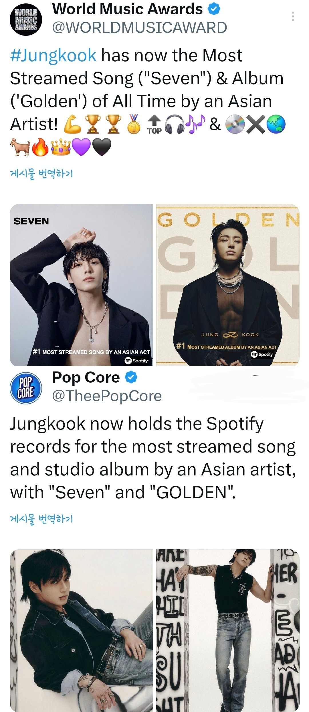According to the World Music Awards (WMA), also known as Europe's Billboard, and Pop Core, a foreign music media outlet, Jungkook was listed as an Asian artist with both "Seven," the most streamed sound source on Spotify, and the full-length album "GOLDEN."