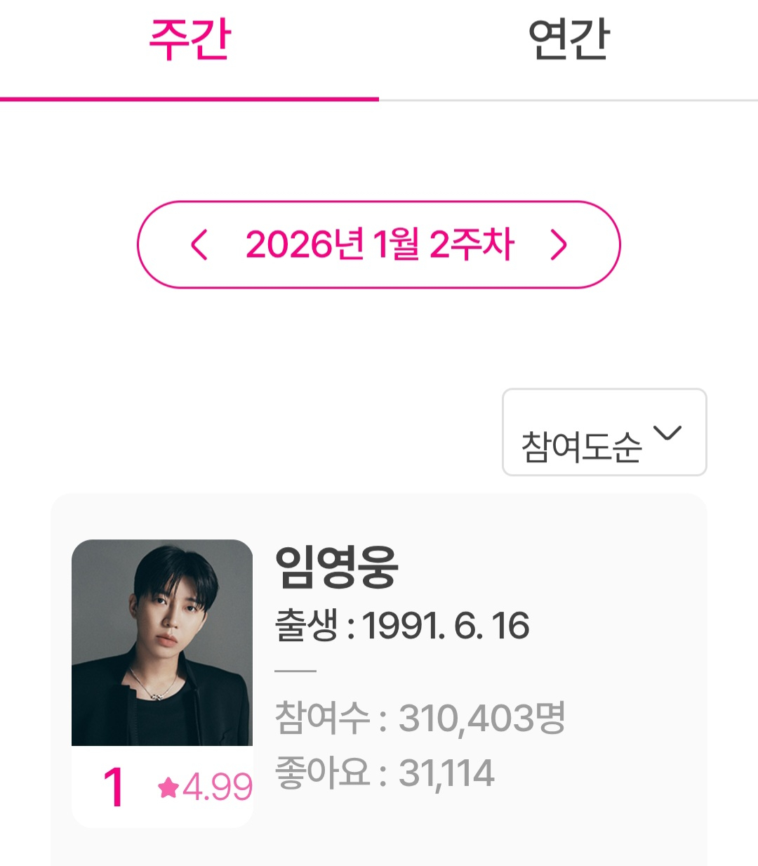Lim Young-woong recorded the most votes with 310,403 votes in the idol chart rating ranking for the second week of January, which was compiled from January 12 to January 18.