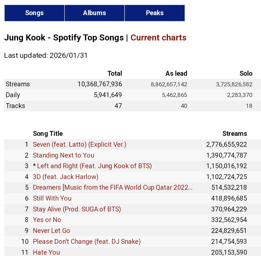 Jungkook's Spotify account recorded the highest number of plays, with his first solo debut song "Seven" playing more than 2.77 billion times. The song set a new record for the first Asian singer and the shortest time. Then, the title song of the solo album "GOLDEN" has more than 1.39 billion times, the collaboration song "Left and Right" has more than 1.15 billion times, the solo single "3D" has more than 1.1 billion times, the official soundtrack for the FIFA Qatar World Cup 2022 has more than 510 million times, and the self-composed song "Still With You" has more than 410 million times.